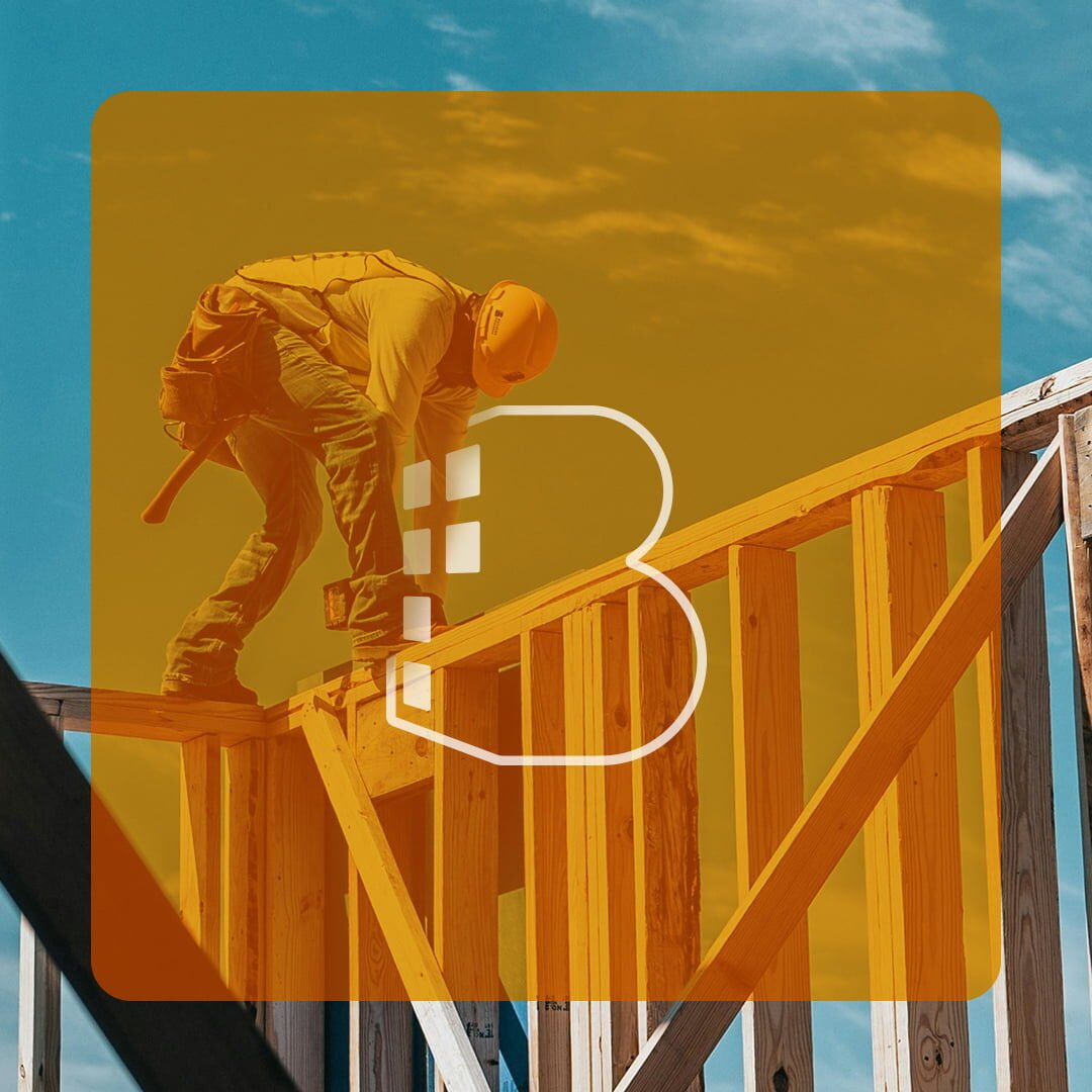 The logo is a conceptual representation that can be interpreted as a “B”, a brick, or a building with lighted windows, reinforcing its connection with the construction sector.